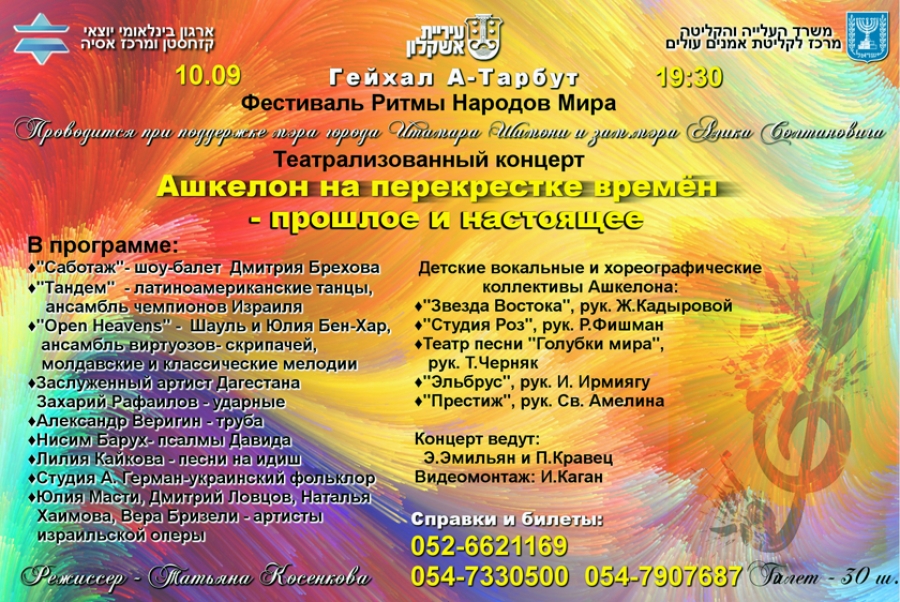 Режиссёр концерта - известная жителям Ашкелона Татьяна Косенкова, осуществившая в течение 6-ти последних лет яркие культурные проекты в городе.