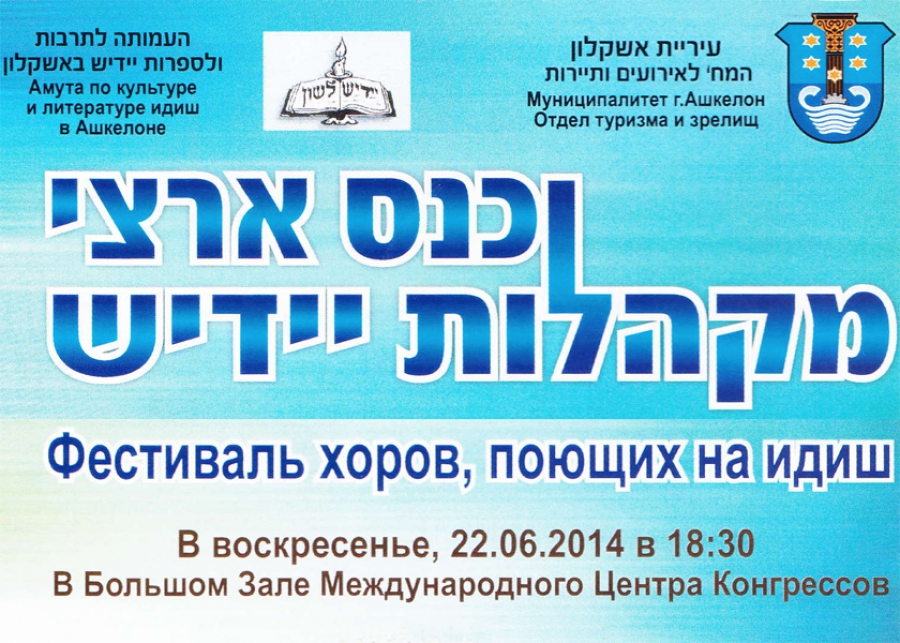 22 июня 2014 года в 18:30 в большом зале Международного Центра Конгрессов Ашкелонского колледжа состоится ежегодный всеизраильский Фестиваль хоров, поющих на идиш.