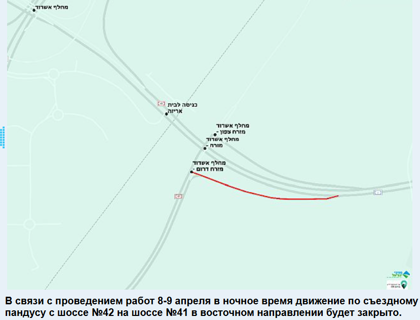 Компания "Нетивей Исраэль" сообщает, что в связи с проведением работ по асфальтированию пандуса на съезде с шоссе №42, в период с понедельника по среду, 8-9 апреля 2025 года, с 23:55 до 05:00 утра следующего дня, движение по съездному пандусу с шоссе №42 на шоссе №41 в восточном направлении будет закрыто. Проезд в сторону Иерусалима/Беэр-Шевы будет невозможен.