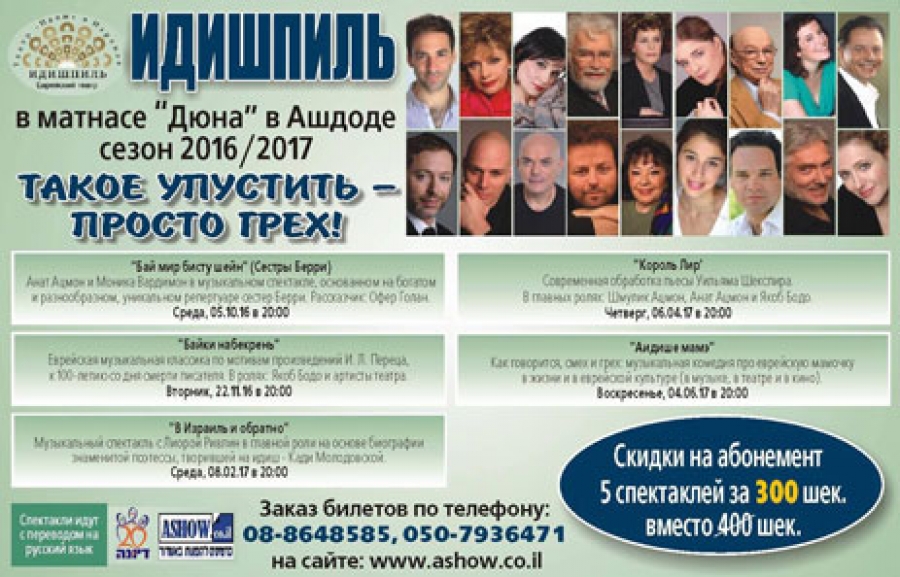 В общем, пять спектаклей театра «Идишпиль» в «Дюне» - это событие сезона, которое невозможно пропустить. Это незабываемые театральные работы, и вы получите от них огромное удовольствие, в независимости от того, знаете вы идиш в совершенстве или помните только несколько слов. Ашдодская Компания по культуре с удовольствием поддерживает все проекты этого театра. Заказ билетов по телефону: 08-8648585, 050-7936471 и на сайте: www.ashow.co.il