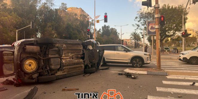 А сегодня утром на улице Дов Гур в районе Вав произошло серьёзное ДТП: автомобиль перевернулся на бок, пострадала 41-летняя женщина-водитель.