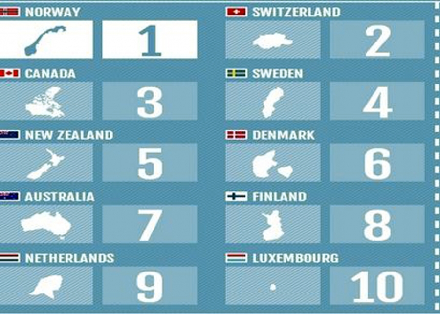 Из стран ближневосточного сегмента Израиль по общему Индексу процветания занимает третье место после Объединенных Арабских Эмиратов (28 место) и Кувейта (33 место). Ну, а первая десятка рейтинга выглядит следующим образом: