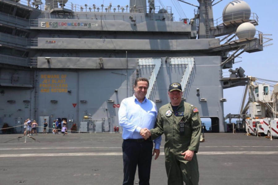Министр разведки и транспорта Исраэль Кац посетил сегодня авианосец "George H.W. Bush ", который бросил якорь в акватории Хайфского порта. Это первый визит министра на самый крупный военный корабль в мире.