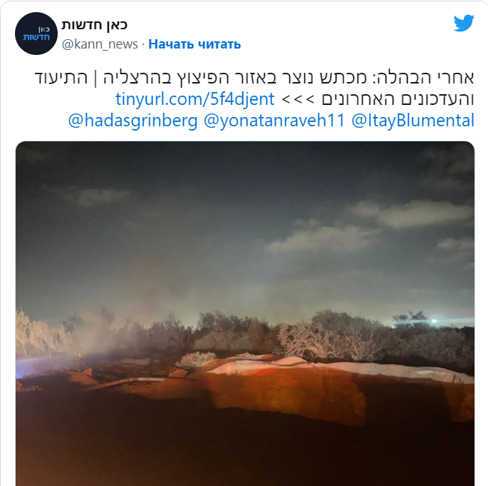 Позднее в Твиттере новостной службы "Кан" была опубликована фотография кратера образовавшегося на месте взрыва в районе Ноф Ям в Герцлии.