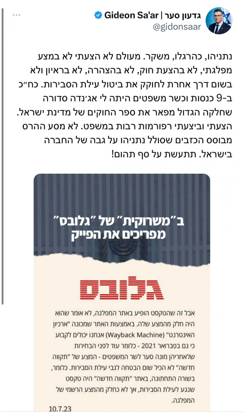 Бывший министр юстиции Гидеон Саар прокомментировал заявление премьер-министра Нетаньягу: