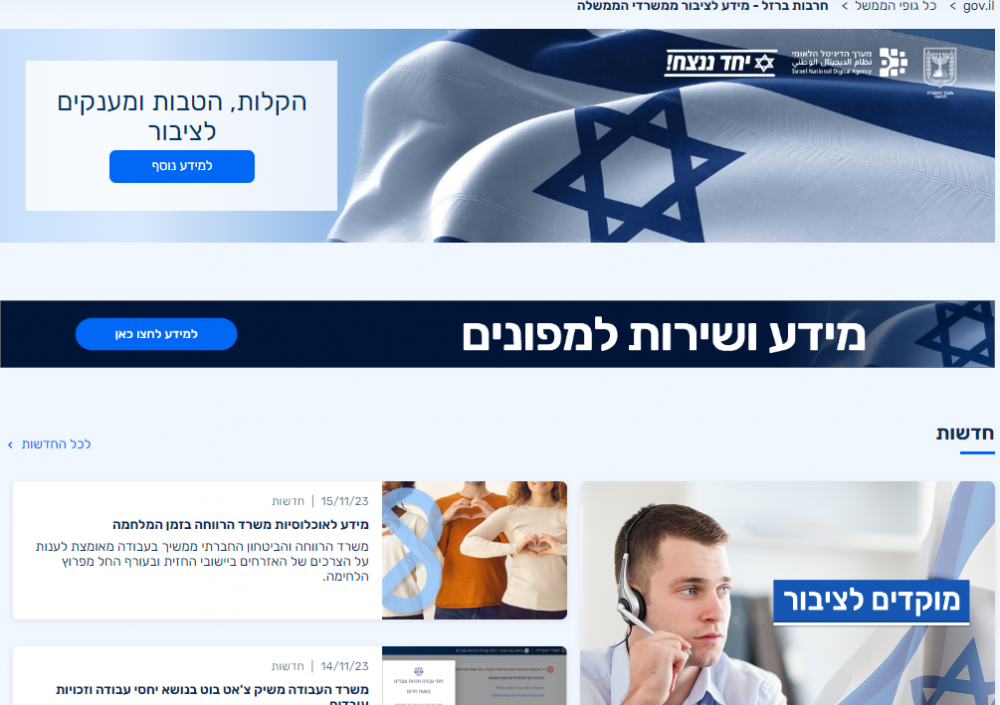 Национальный департамент общественной дипломатии канцелярии главы правительства в сотрудничестве с Национальной цифровой системой собрал всю информацию министерств и ведомств Израиля, предназначенную для общественности в военное время на едином веб-сайте.