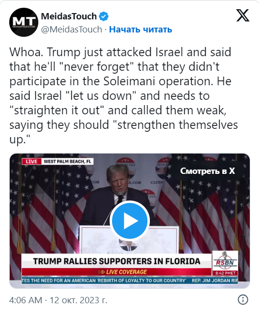 По словам Трампа, Израиль не может "играть в игры", а должен укрепить свои силы. Отдельно он накинулся на премьер-министра Биньямина Нетаниягу относительно ликвидации Штатами главы элитного подразделения КСИР "Аль-Кудс" Касема Сулиймани.