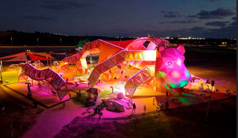 Благодаря особой световой конструкции, меняющей цвет, скульптура льва подсвечивается издалека, и никто не пропустит ее в любое время суток. Освещение также гармонично интегрировано в комплекс, и все игровые зоны освещены.