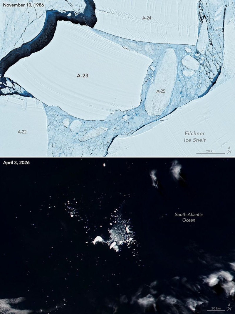 В начала путешествия площадь айсберга составляла больше 4000 км² (это чуть меньше, чем территория Иудеи и Самарии). Но в 2025 году от него откололись крупные куски, и к январю 2026 года его площадь уменьшилась до 1182 км². К апрелю он переместился в более теплые воды, к северу от Южной Георгии и Южных Сандвичевых островов, дрейфовал и стремительно таял. На первом снимке показано, каким айсберг был в 1986 году и каким стал в начале апреля 2026 года. На остальных фото и видео — айсберг в 2025 году.