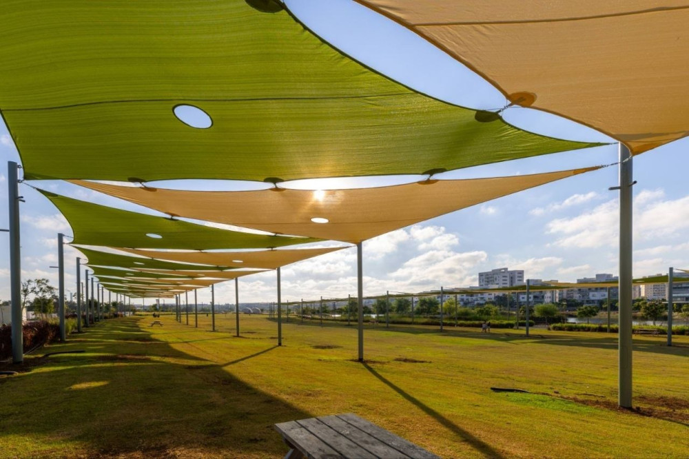 Зона барбекю в эко-парке Ашкелона на большом газоне рядом с озером