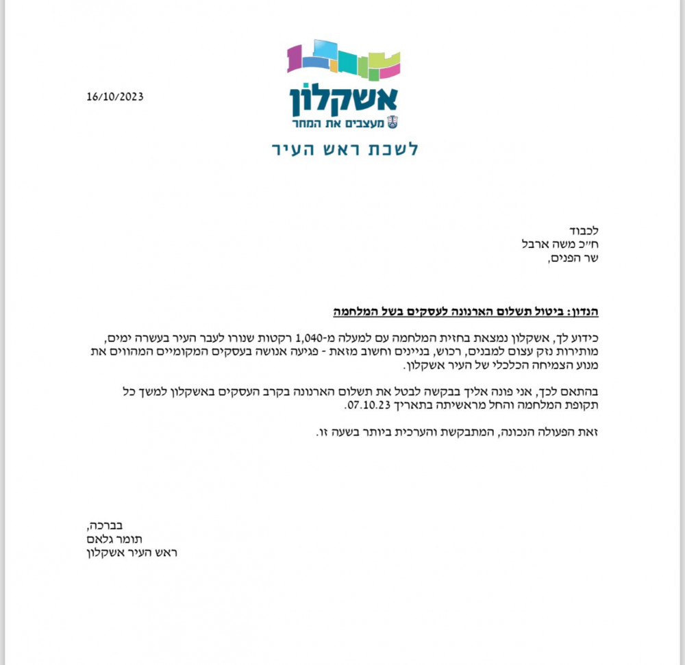 Вчера вечером, 16.10.23, мэр Ашкелона обратился с письмом к министру внутренних дел, депутату Кнессета Моше Арбелю, в центре которого находится просьба отменить уплату налога на имущество среди владельцев предприятий в Ашкелоне на срок боевых действий.