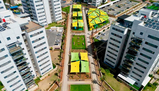 В рамках проекта в центре жилых домов был проложен длинный бульвар для отдыха и досуга, который тянется вдоль улицы Монтефиоре до улицы 29 Ноября. В новом комплексе установлены инновационные красочные игровые площадки для всех возрастов, площадки для подростков и игровая площадка для малышей.