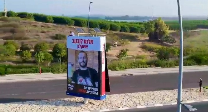 Сегодня (3 ноября) мэрия Ашкелона вывесила плакаты с призывом вернуть похищенных, в том числе жителя Ашкелона Алекса Лобанова, уведенного в Газу седьмого октября.