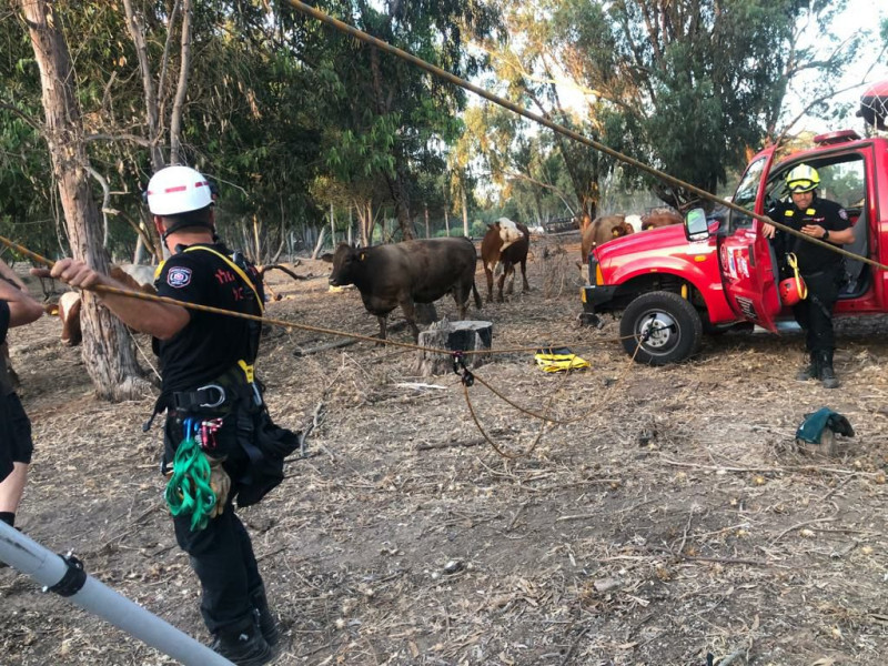 На вызов выехала бригада специального спасательного отряда в составе пожарных региональной станции Ашкелон, которая по прибытии на место подготовилась к спасению теленка с помощью специальной спасательной техники.