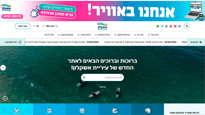 Муниципалитет Ашкелона в настоящее время запускает новый, современный веб-сайт. Сайт, созданный в сотрудничестве с Национальной цифровой сетью в рамках новой системы, разработанной специально для нужд местных органов власти, предлагает удобный и простой просмотр, современный и приятный дизайн, а также контент, доступный жителям простым, умным и привлекательным способом.