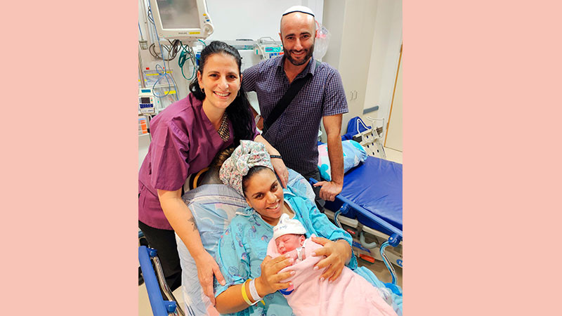 Роды прошли в частной машине, прямо на парковке родильного отделения. Наша замечательная акушерка Бетиана Шамай Лейбовиц поспешила на место и приняла роды спокойно, уверенно и с непревзойдённым профессионализмом.