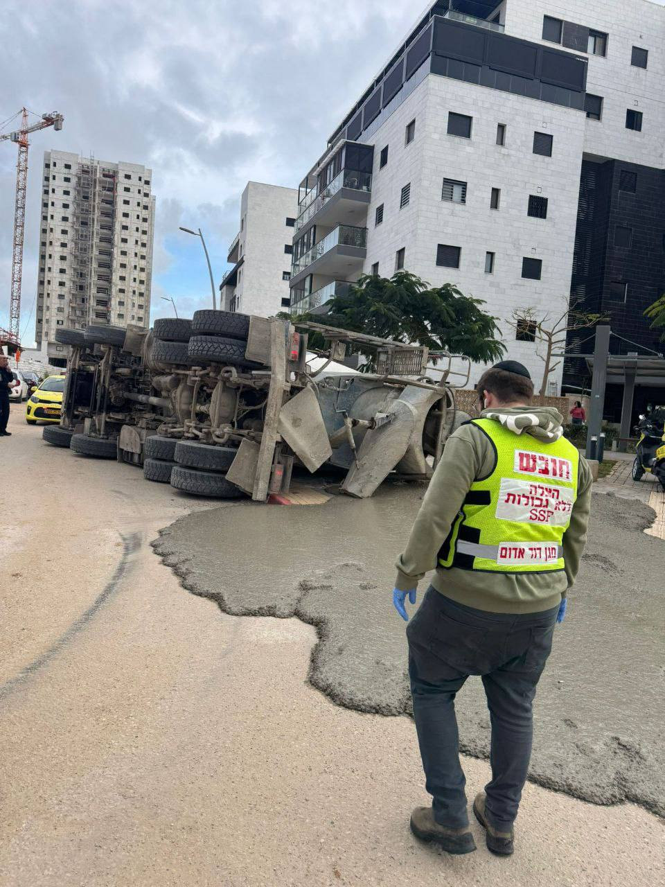 В 15:17 на горячую линию 101 MDA в Лахишском районе поступило сообщение о перевернувшемся грузовике с бетоном на улице Агот в Ашкелоне.