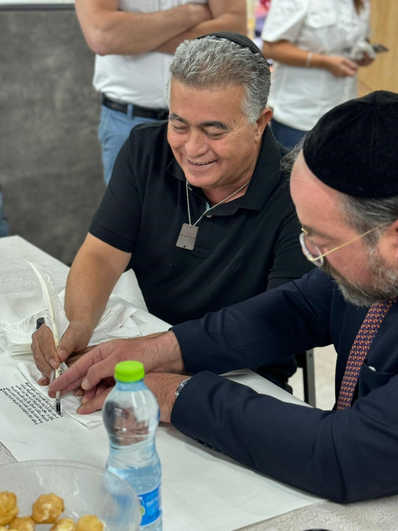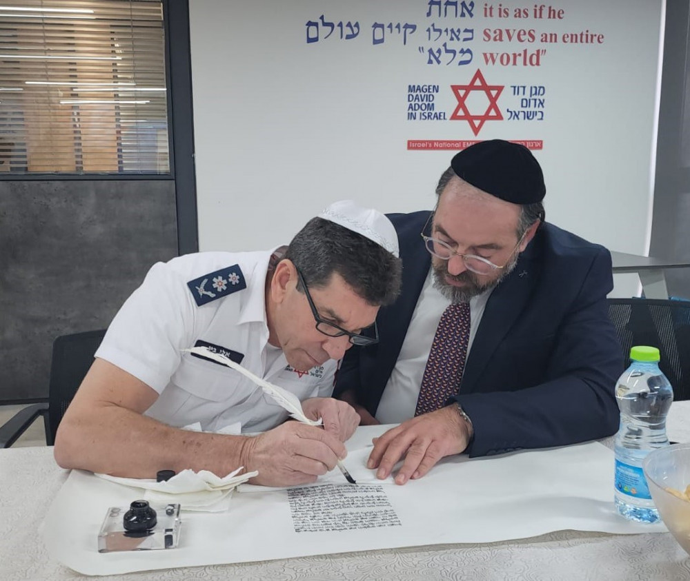 В рамках проекта единства на этой неделе (понедельник) раввин района Цахала в Тель-Авиве раввин Хаим Хорвиц приехал в интегрированный национальный центр Маген Давид Адом и почтил генерального директора MDA Эли Бина, председателя совет директоров аэрокосмической отрасли Амир Перец, волонтер MDA Мири Богдана. Они и другие медики и парамедики пишут письмо на пергаменте Торы. Послание будет размещено у Стены Плача