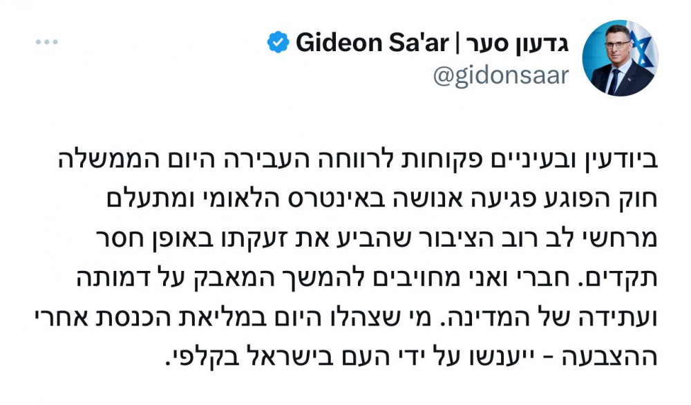 Гидеон Саар: Сознательно и с широко открытыми глазами правительство приняло закон, наносящий значительный ущерб национальным интересам