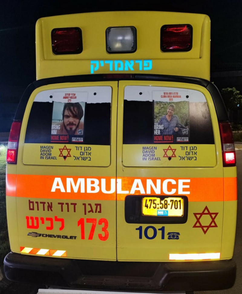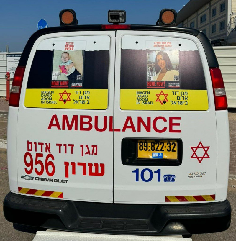 В знак сочувствия боли семей похищенных руководство Маген Давид Адом вчера вечером (воскресенье) приняло решение, что на задние стекла всех машин скорой помощи будут наклеены фотографии с лицами и именами похищенных, удерживаемых в Газе. и машины интенсивной терапии по всей стране.