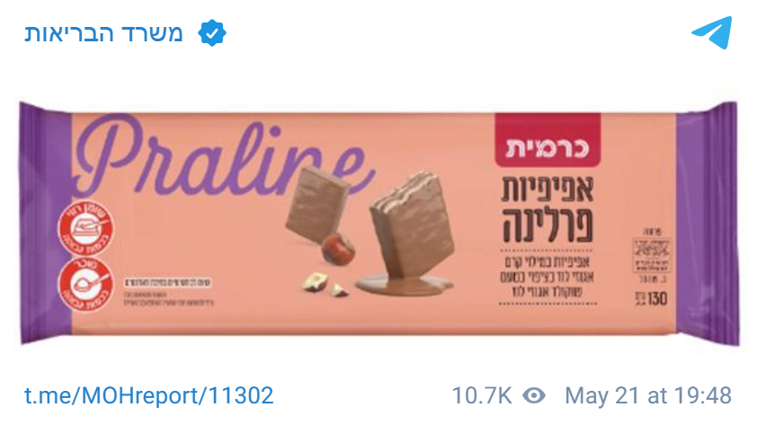 Предприятие «Кармит таасийот мамтаким» изымает из продажи конфеты Praline (см. фото ниже) весом 130 граммов, парве, в связи с тем, что на упаковке не указано наличие аллергена – молока.