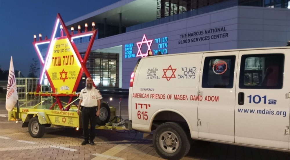 Раввин Йонатан Спитцер, волонтер MDA в качестве водителя скорой помощи, врача скорой помощи и директора MDA Chabad House. В разгар коронакризиса Спитцер инициировал специальный проект, в рамках которого он путешествовал по стране с автомобилем. скорая помощь-ханукия, чтобы привнести дух праздника в бригады МДА А. Работали круглосуточно. С тех пор проект стал традицией, и это уже четвертый год, когда гигантская менора прикрепляется к прицепу машины скорой помощи MDA, на котором Спитцер ездит по станциям MDA, разбросанным по всей стране.