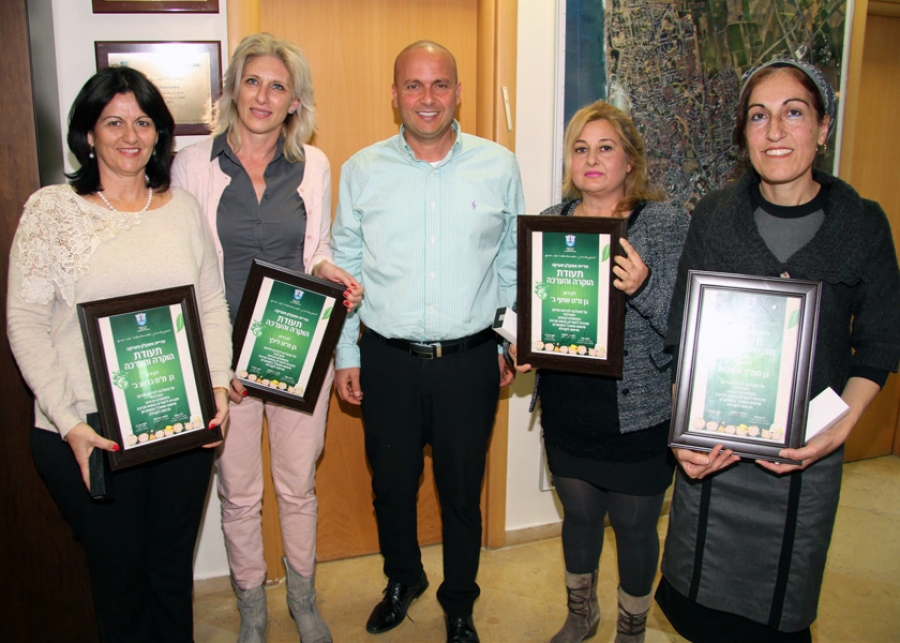 На прошлой неделе воспитательницы: Эти Альмог, Шула Далькиан, Мириам Купер и Эдна Сомах были приглашены к мэру города и получили из его рук почётные знаки. Также Итамар Шимони пожелал воспитателям продолжать усилия по развитию обучения в области охраны окружающей среды.
