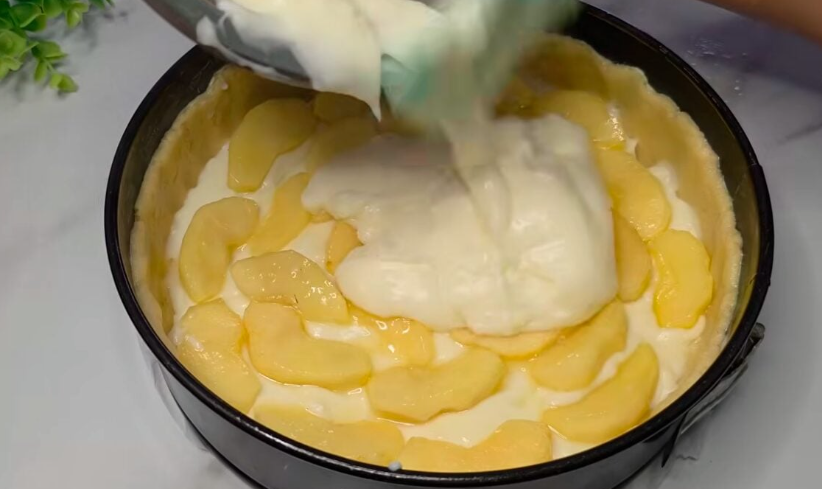 - Выложите на тесто половину крема. Разложите кусочки карамелизированных яблок. Накройте второй частью крема. Разровняйте по всей поверхности равномерно лопаткой. Подровняйте бортики.