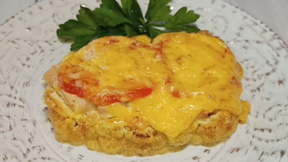 Выложите сверху кусочки куриного филе, порезанного слайсами, свежего помидора, посолите, поперчите (по вкусу) и посыпайте все тертым сыром.