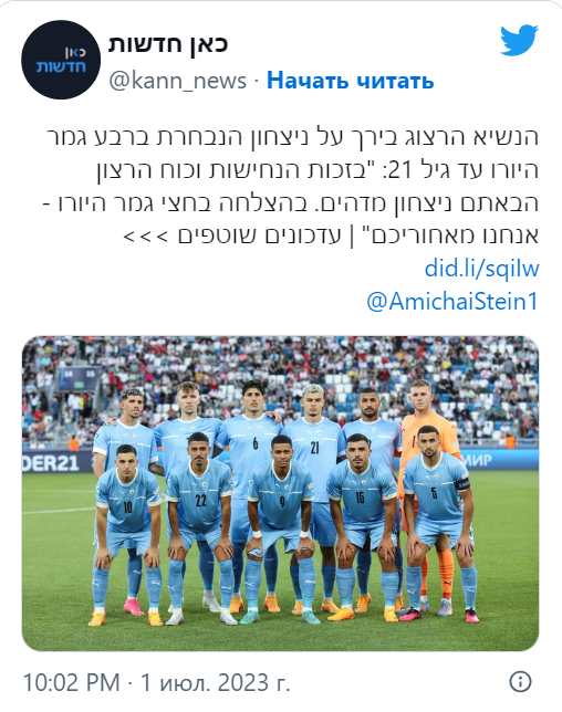 "Молодцы игроки молодежной сборной Израиля по футболу, добившиеся грандиозного достижения", - поздравил их премьер-министр Биньямин Нетаниягу.