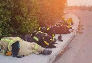 Снимок уставших, но гордых израильских пожарных, спящих прямо на асфальте в полной экипировке после тушения масштабного пожара в районе кибуца Цуба, стал вирусным.