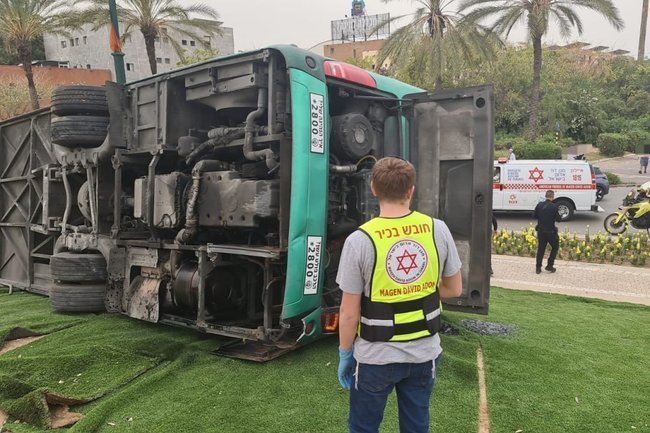 А во вторник, 8 апреля, в 14:27 в экстренную службу «Маген Давид Адом» поступило сообщение о серьезной аварии на улице Леви Эшкол в Ришон-ле-Ционе, в результате которой перевернулся автобус.