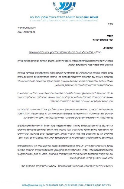 Накануне воскресного заседания правительства, руководители местных органов власти Иудеи, Самарии и Иорданской долины отправили министрам правительства письмо с жёстким содержанием. Это произошло после того, как министры решили исключить из повестки дня вопрос об утверждении бюджета для обеспечения безопасности населённых пунктов в регионе.