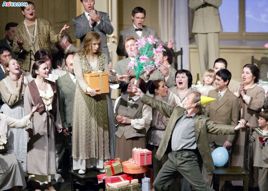 Опера Чайковского, во всём мире уважительно именуемого Петром Ильичом, на сей раз превратилась в трагикомедию. Где куплеты Трике поёт сам Ленский, стреляя из хлопушки; где нет дуэли, а есть ружьё, которое, если оно присутствует, непременно выстрелит; где Онегин пытается застрелиться у ног Татьяны, вот только пистолет даёт осечку; где почти все персонажи выглядят шаржем на самоё себя.