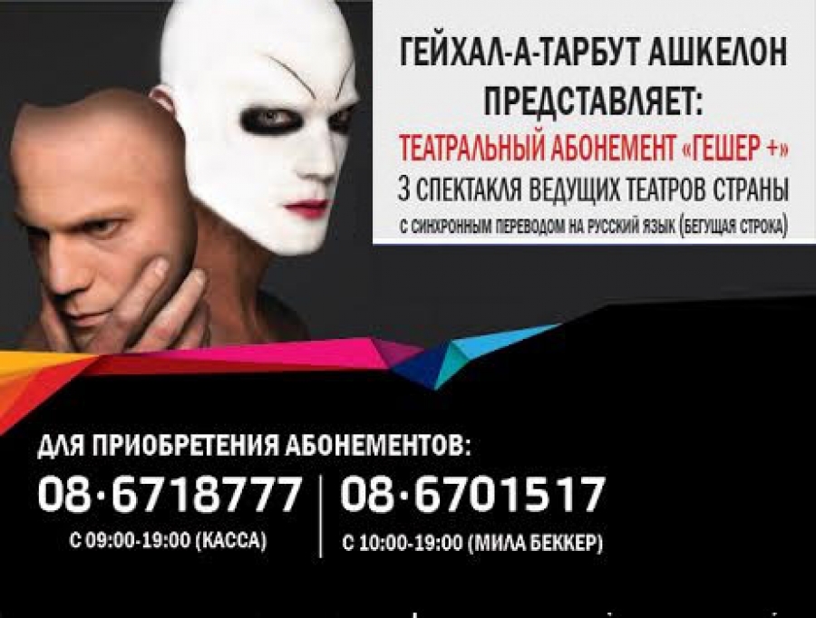 Гейхал-А-Тарбут в Ашкелоне: Театральный абонемент "Гешер+" 31 августа 2016 20:52 ' Источник: Источник