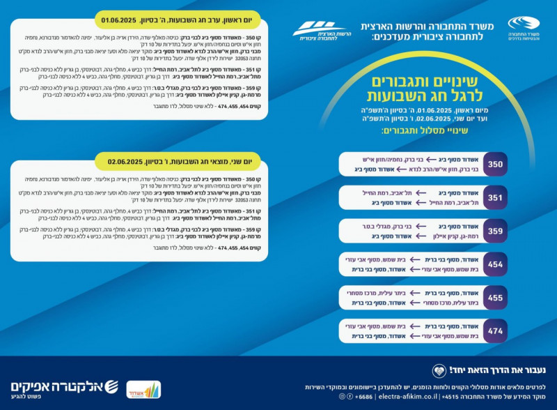 Министерство транспорта и Национальное управление общественного транспорта объявили об изменениях в расписании общественного транспорта в связи с праздником Шавуот. С 1 июня (воскресенье, 5 сивана 5785) по 2 июня (понедельник, 6 сивана 5785) на ряде маршрутов, проходящих через Ашдод, будет увеличена частота рейсов, а также добавлены новые заезды и остановки.