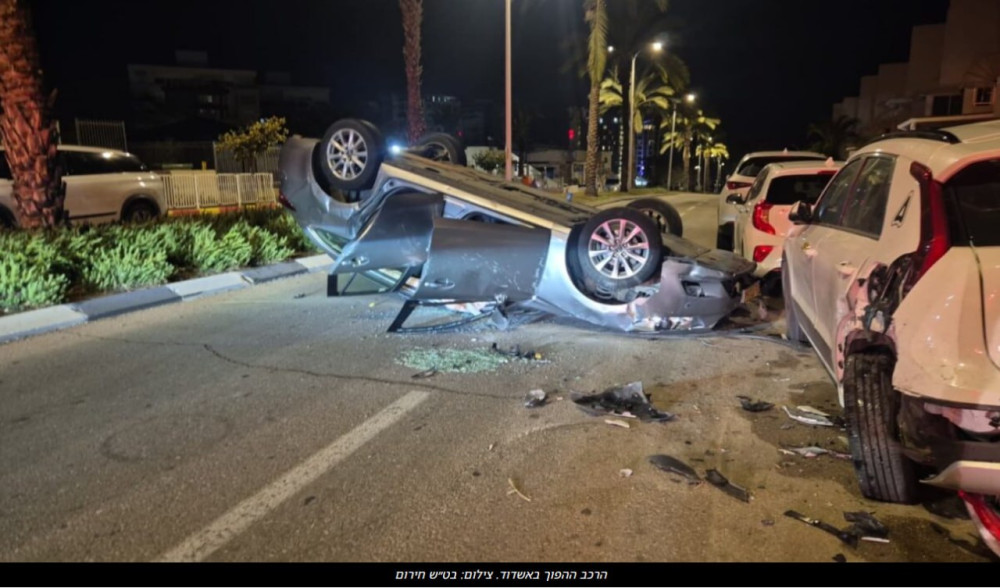 ДТП произошло минувшей ночью на улице Шдерот а-Ям а-Тихон в Ашдоде, рядом с отелем «Леонардо». Легковой автомобиль перевернулся на крышу после столкновения с припаркованными машинами, причинив серьёзный ущерб на месте происшествия.