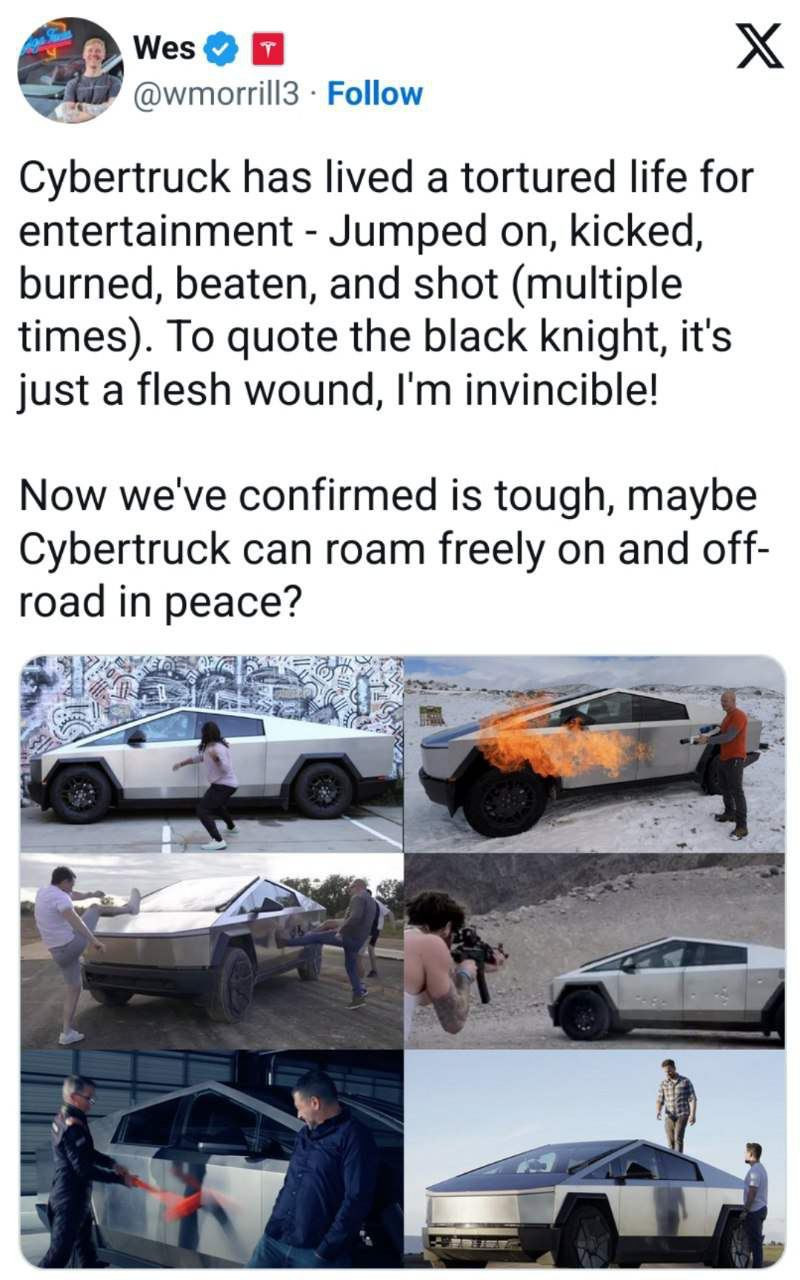 Во время анонсов автомобиля Cybertruck компания Tesla заявила, что машина будет пуленепробиваемой и очень прочной. И сейчас богатые люди, специально купив этот эксклюзив за $100 тысяч за базу (80 тысяч без налогов), массово стреляют в нее, прыгают на ней, поджигают и выкладывают это в соцсетях. Все замечательно горит, а пуленепробивными оказалась только дверца со стороны водителя и задняя. С другой стороны, спереди и сзади нет бронирования.