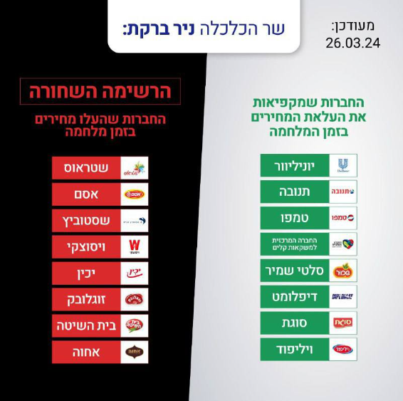 Ранее в этом месяце Баркат объявил, что последним шагом в регулировании защиты потребителей станет нанесение черной наклейки на продукты, цены на которые во время войны повышались без одобрения правительства.