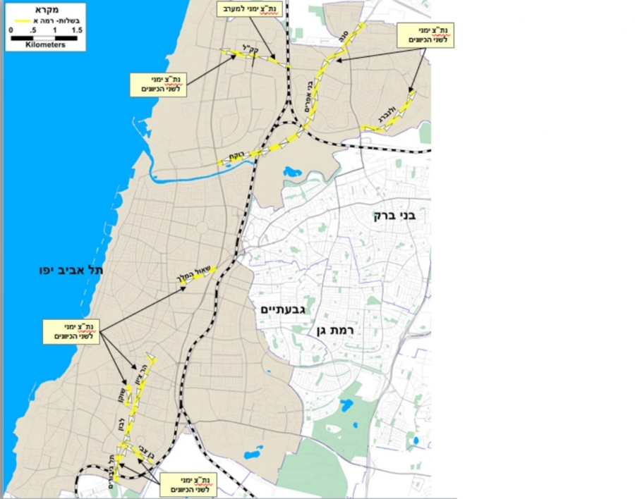 На первом этапе планируется создание 15 километров отдельных полос для движения общественного транспорта на следующих дорогах: Моше Снэ - Бней – Эфраим – Роках. Здесь для общественного транспорта будет создана правая полоса в обоих направлениях протяженностью 5,3 км. По бульвару Шауль ха-Мелех – на участке между Намир и Эвен-Гвироль будет проходить специальная полоса для общественного транспорта протяженностью 1,2 километров в обоих направлениях.