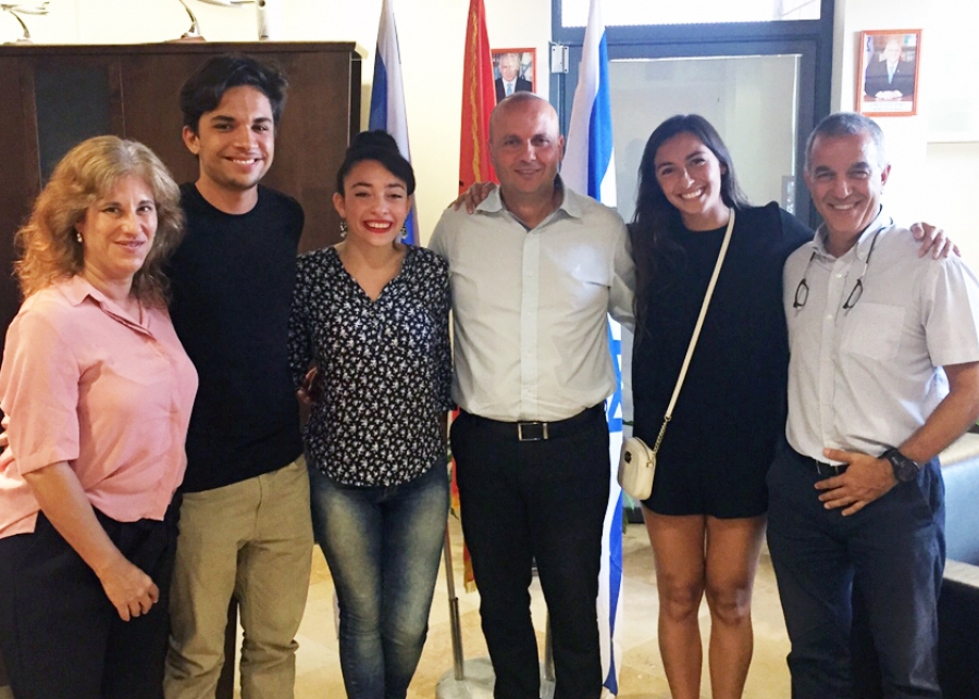 'В четверг 6 августа мэр города Итамар Шимони принял в своем офисе трех посланцев, ашкелонских школьников, которым выпала честь отправиться от имени города в еврейские общины американского Балтимора и канадского Ванкувера. Члены делегации – Матан Адар, 18 лет, Юваль Саадон, 18 лет и Томер Тетеро, 18 лет. Первые двое поедут в Балтимор, а Томер – в Ванкувер. Лучшие в сфере успеваемости и общественной работы выпускники школ города будут проживать в еврейских общинах Ванкувера и Балтимора, способствуя укреплению связей между ними и Израилем.