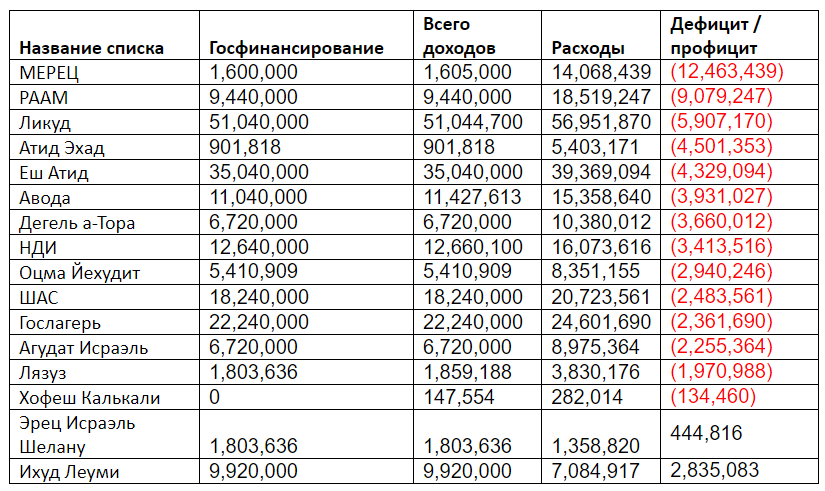 В аспектах финансовых результатов деятельности (дефицит / профицит), аудит выявил, что предвыборный период 14 партий, участвовавших в выборах, закончили с дефицитами от нескольких десятков тысяч шекелей до около 12.4 миллиона шекелей, с общей суммой дефицита в размере примерно 59.4 миллиона шекелей. В то же время только две партии остались "в плюсе" на совокупную сумму около 3.2 миллиона шекелей. Эти долги / бюджеты были зафиксированы на текущих счетах фракций.