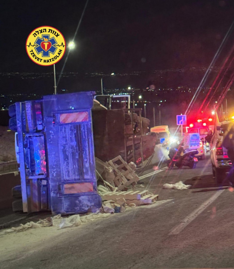 На 1-м шоссе, в районе перекрестка Альмог, перевернулся грузовой автомобиль с палестинскими номерными знаками.