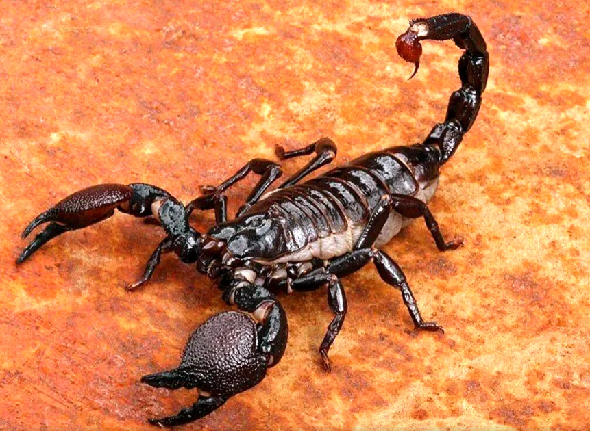 Один из самых ядовитых скорпионов в мире. Активен ночью, прячется днем. Укус вызывает жгучую боль, судороги, лихорадку и может быть смертельно опасен для детей.