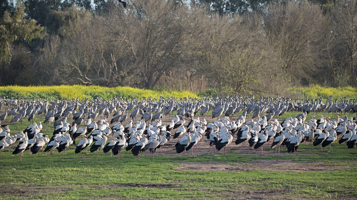 Первая стая аистов прилетела в заповедник Агмон ха-Хула. Зима в этом году так и не пришла по-настоящему, но весна настойчиво заявляет о себе. Первая группа аистов остановилась в Агмон на ночлег. В ближайшие недели над Израилем пролетят около 600 000 аистов!