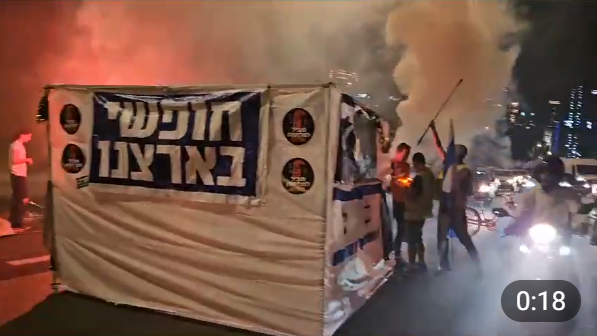 Этой ночью в результате протестов на улице Каплан протестующие установили традиционную сукку, назвав ее “Сукка Надежды”. Несколько граждан привязали себя к шалашу.