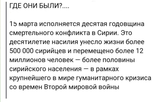 А еще поинтересовались, почему их не беспокоит катастрофа в Сирии, где погибло и бежало в двадцать раз больше людей. Кстати, к ней напрямую причастна России, стершая с лица Земли целые города с населением, как Мариуполь и десятки других в Украине. Только в одном Алеппо российсикми ковровыми бомбардировками убито больше 31 тысячи женщин и детей.