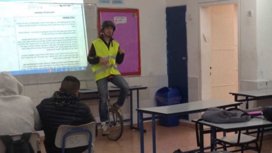 В рамках этих мероприятий, каскадёр пришел к старшеклассникам с моноциклом и рассказал им на жизненных примерах о законе езды на электрическом велосипеде.