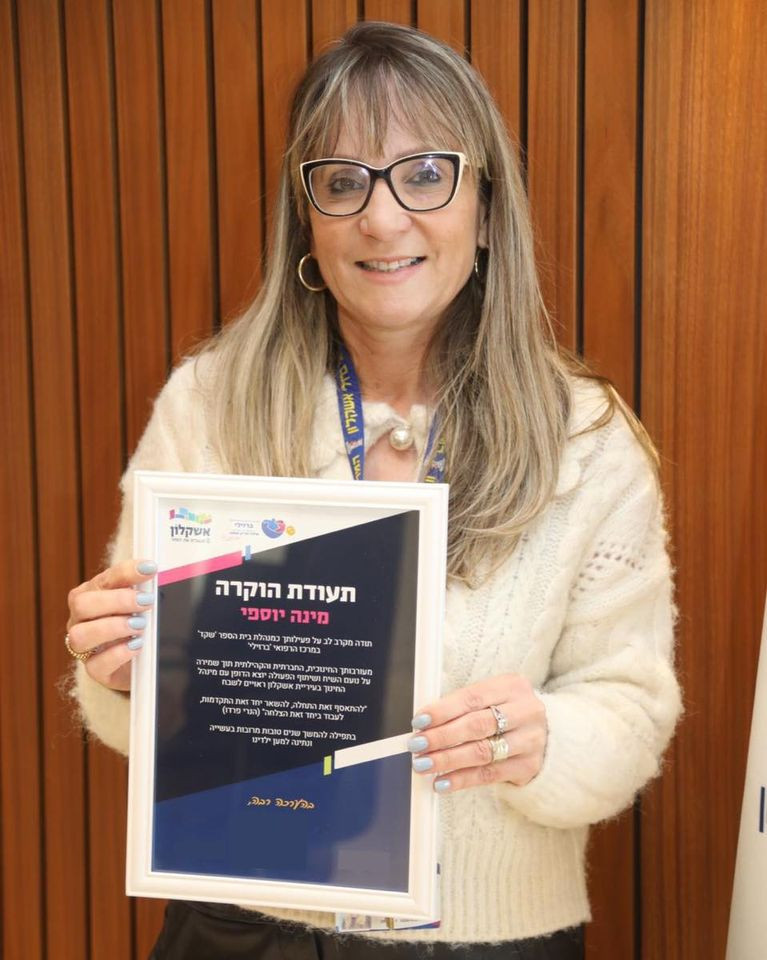 На этой неделе мэр города вручил благодарственную грамоту директору школы «Шакед» Мине Йосефи за ее работу на благо учащихся и их семей в течение последних 12 лет.
