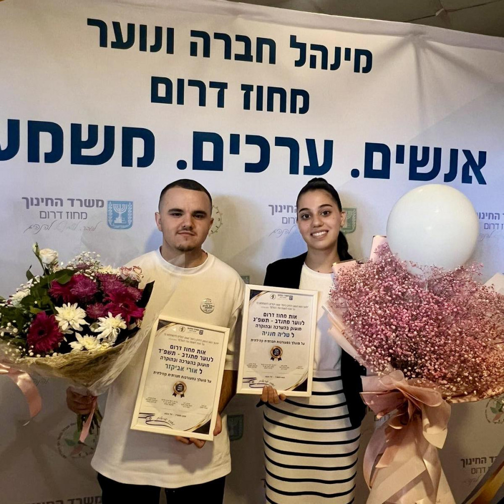 Председатель Муниципального молодежного совета Ури Авиказар и Талия Ханания, молодая женщина и именинник, выиграли в прошлый четверг (18 июля) флаг Даромского района для волонтерской молодежи на 2017-2018 годы на церемонии, состоявшейся в Димоне с участие старших должностных лиц Министерства образования и местных органов власти.